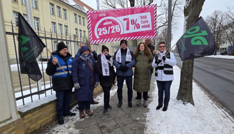 *Einkommensrunde 25/26* Am 08.01.2026 fand in Vorbereitung auf die 2. Runde der Tarifverhandlungen der Länder in Potsdam eine Mahnwache vor der Staatskanzlei Brandenburg statt. Der